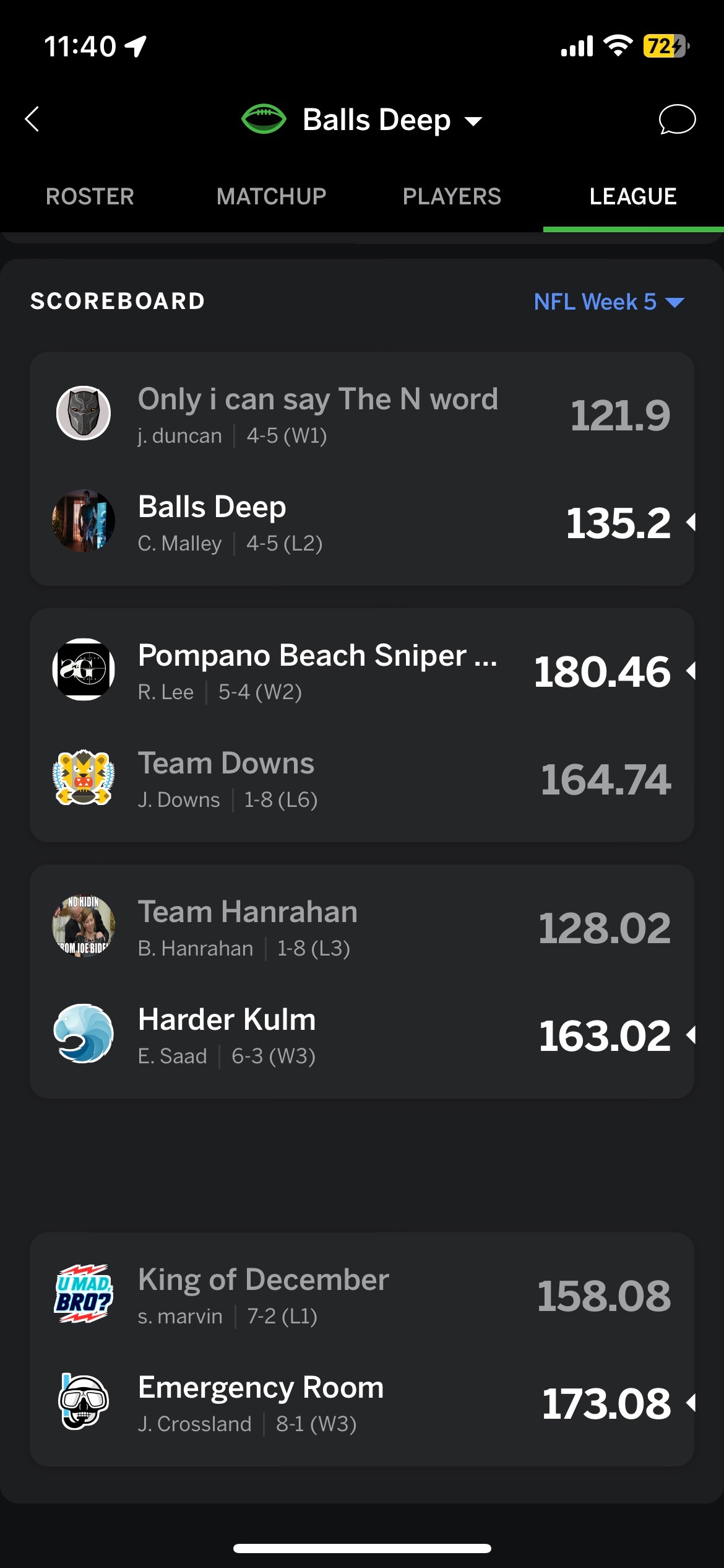 Just as only one can say the n word, one of us had to come out on top. In this matchup Only I can Say the N word had the power of divorce on his side as Tom Brady looked to cook the Falcons in their matchup. With a rather good performance it was not enough for his team to come out on top. Kamara looked bright in his return but a late fumble was costly for him and the vulture that is Taysom Hill seems to be the only viable member of the saints who can score a touchdown. Balls Deep on the other hand had a well rounded performance from his players capped off by a great showing from Dalvin Cook and Jeff Wilson. Balls Deep moves to 2-3 as Only I can Say the N word falls to 2-3.